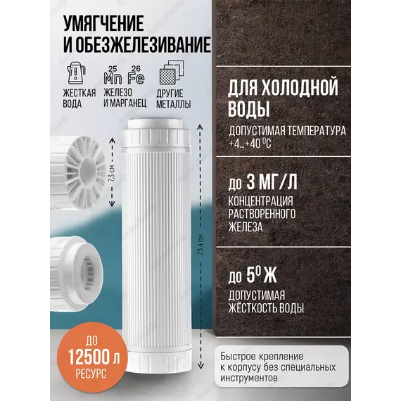 Ресурс картриджа: до 12500 л (При содержании в воде железа до 1 мг/л, марганца до 0,2 мг/л.).