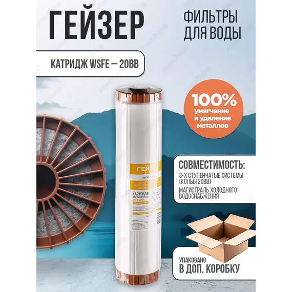 Картридж Гейзер WSFE – 20BB предназначен для удаления солей жесткости (кальция и магния), железа, марганца и других тяжелых металлов.