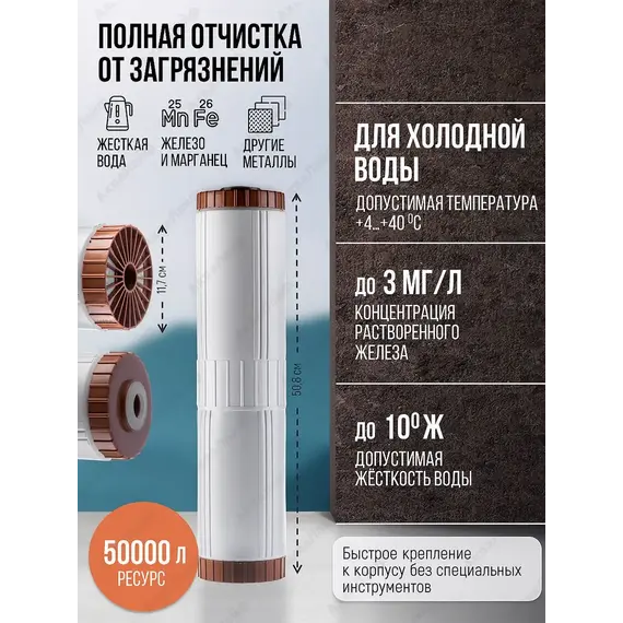 Ресурс картриджа: до 50 000л (При содержании в воде железа до 1 мг/л, марганца до 0,2 мг/л.).