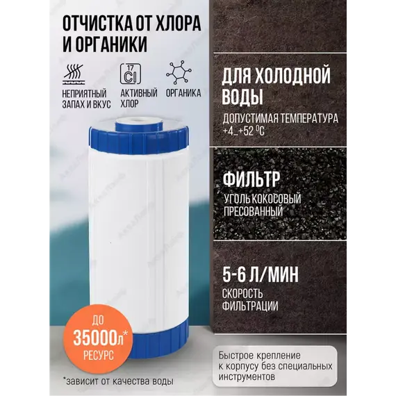 КУ - 10ВВ – картридж с гранулированным активированным углем из скорлупы кокосов. Используется для удаления из воды хлора, органических примесей, неприятного запаха и вкуса.
