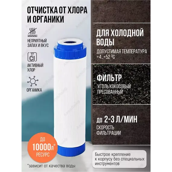 Картридж с гранулированным активированным углем из скорлупы кокосов. Используется для удаления из воды хлора, органических примесей, неприятного запаха и вкуса.