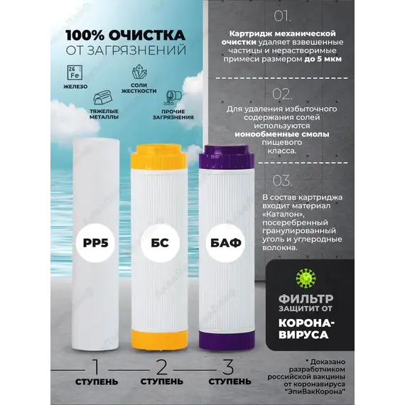 Комплект картриджей "С-2" предназначен для трехступенчатых фильтров Гейзер Стандарт для жесткой воды.Признаки жесткой воды: накипь белого цвета в чайнике, белый налет на сантехнике, пленка в чае.Также совместим с другими трехступенчатыми системами Гейзер и системами других производителей стандарт 10SL (Slim Line).Состав:1-я ступень (картридж PP 5 мкр.). Ресурс 10000 литров.2-я ступень (картридж БС). Ресурс 6000 литров.3-я ступень (картридж БАФ). Ресурс 12000 литров.