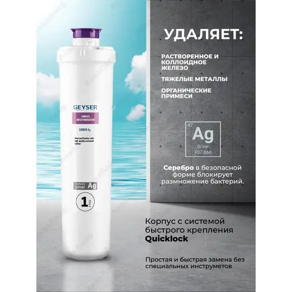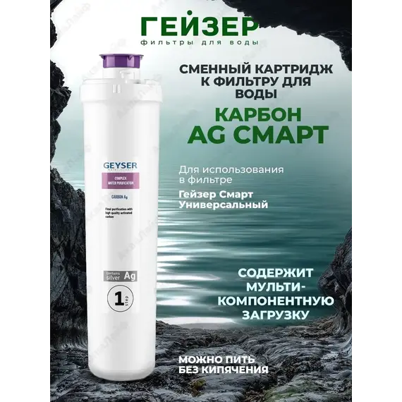 Картридж Карбон Ag Смарт Гейзер 30639 содержит ионы серебра, которые обладают **бактериостатическим эффектом** - не позволяет размножаться бактериям внутри фильтра. Проходя через фильтр воды очищается от **тяжелых металлов, хлора, марганца меди**. Кроме того понижается мутность воды, она **приобретает** **приятный вкус**. Для Гейзер Смарт.