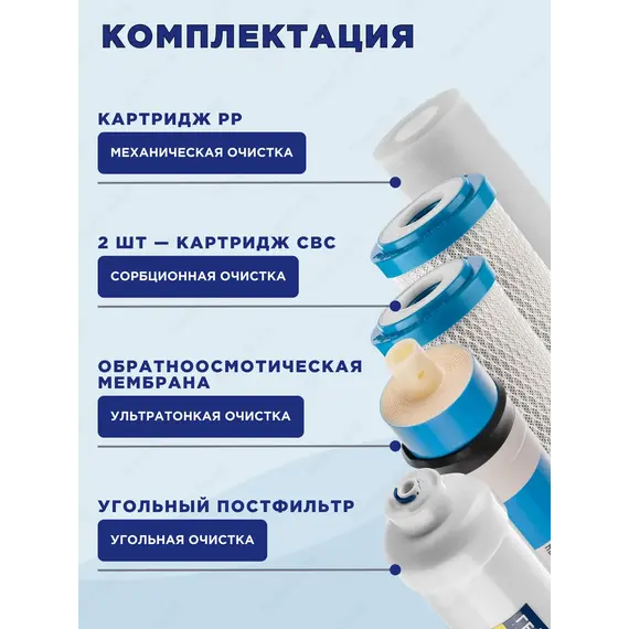 Для Аллегро и Престиж Комплект предназначен для замены, исчерпавших свой ресурс, сменных элементов в фильтрах обратного осмоса. Так же подходит для систем обратного осмоса других производителей. Комплектация: Картридж механической очистки PP 5 - 10SL 2 угольных картриджа CBC 10 - 10SL Обратноосмотическая мембрана Угольный постфильтр.