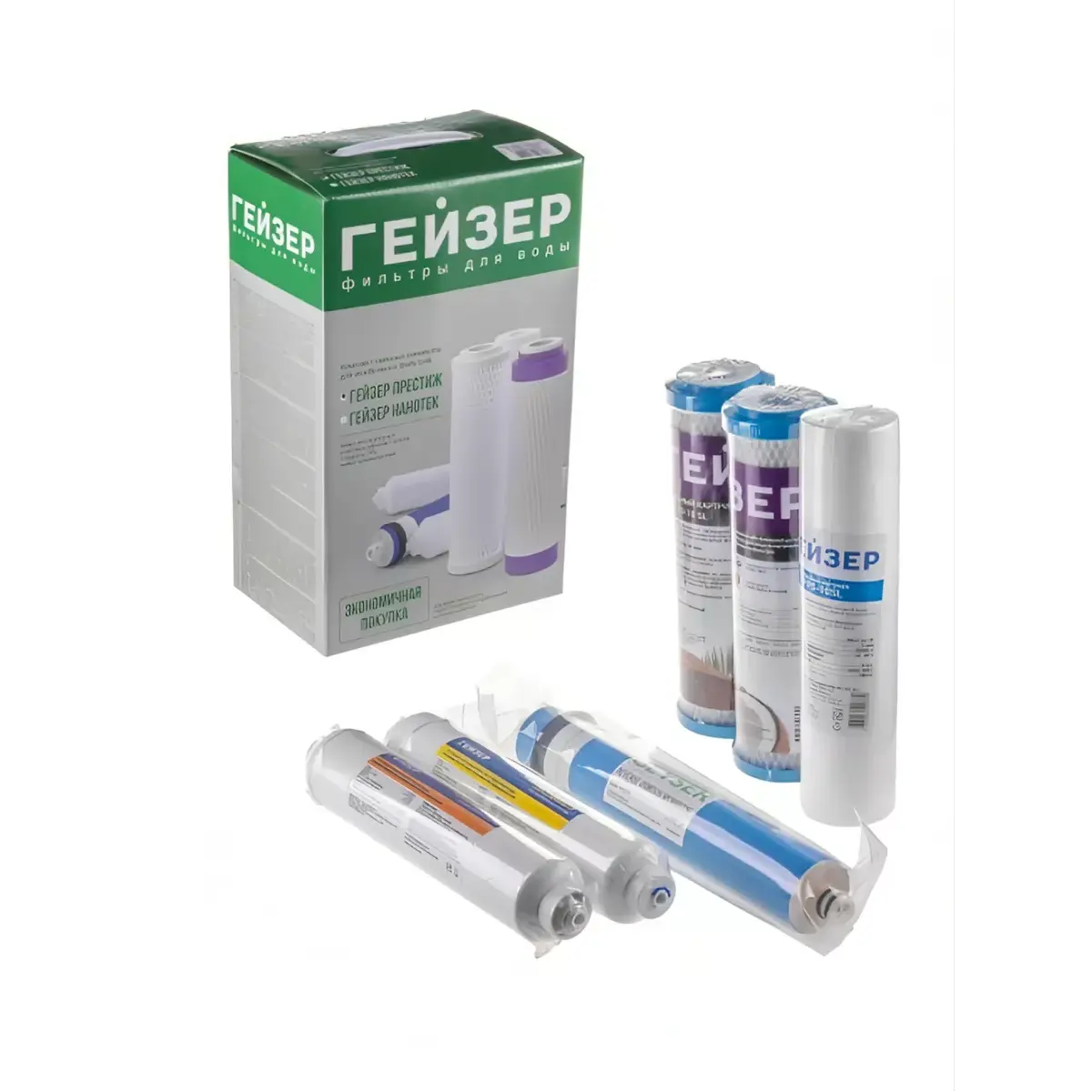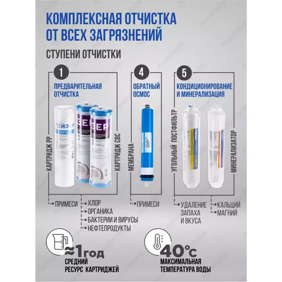 Предназначен для замены исчерпавших свой ресурс картриджей в системах обратного осмоса Гейзер Престиж с минерализатором.Используется в системах Гейзер:Престиж М.Престиж ПМ.Аллегро М.Аллегро ПМ,Так же данный комплект совместим с системами обратного осмоса других производителей стандарта 10"SL (Slim Line).Состав Комплекта "RO2":1-я ступень очистки (Картридж PP). Ресурс 20000 литров.2-я ступень очистки (Картридж СВС). Ресурс 7000 литров.3-я ступень очистки (Картридж СВС). Ресурс 7000 литров.4-я ступень очистки (Мембрана 50 галлон). Ресурс 1,5-2 года.5-я ступень очистки (Угольный постфильтр). Ресурс 1 год.6-я ступень очистки (Минерализатор). Ресурс 1 год.
