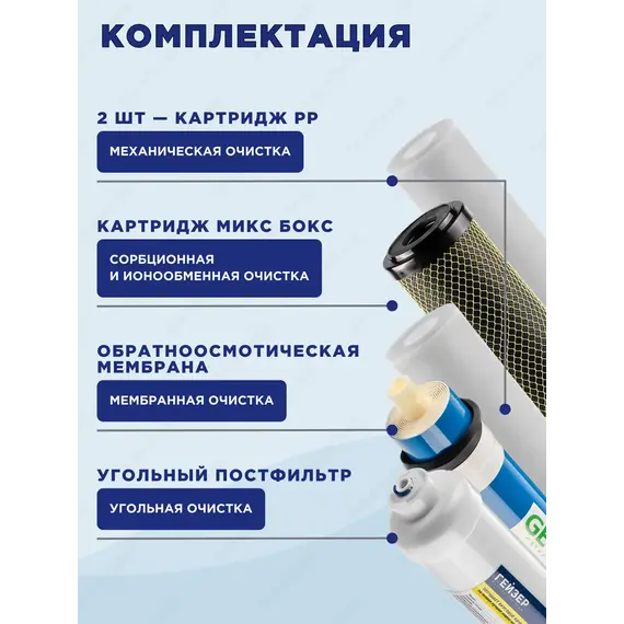 Набор состоит из двух полипропиленовых картриджей (1 и 2 ступень очистки) картриджа Микс Блок (3 ступень), мембраны 1812–50 (4 ступень) и постфильтра (5 ступень).