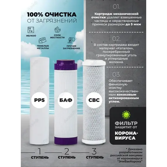 PP 5 - 10SL — удаляет нерастворимые частицы размером до 5 мкм (ржавчина, взвеси);"БАФ - SL10 — универсальный картридж для удаления хлора, органических примесей, железа и тяжелых металлов. Содержит серебро;