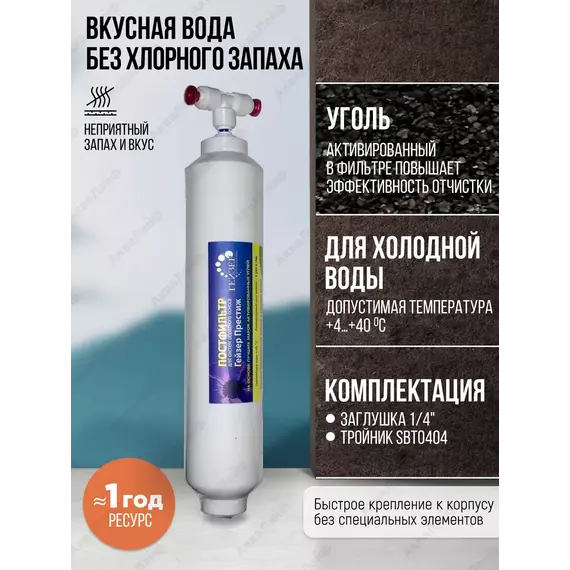 Угольный постфильтр используется для доочистки и кондиционирования воды, очищенной системой обратного осмоса. Удаляет посторонние привкусы и запахи, которые могут появиться при длительном хранении воды в накопительном баке. В комплектацию входят фитинги для подключения.