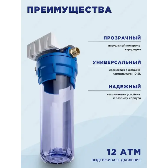 Магистральный фильтр Гейзер 1П, 1/2", для холодной воды, 32007. Фильтр Гейзер 1П 1/2" прозрачный производит тонкую очистку холодной воды от взвешенных частиц (более 5 мкм). В фильтре Гейзер 1П 1/2" используется картридж РР 5 - 10SL (картридж приобретается отдельно). Удаляет ржавчину, песок, ил и другие нерастворимые примеси. Улучшает показатели мутности и цветности воды. Корпус фильтра выполнен из прочного прозрачного пластика. В производстве корпусов используются материалы пищевого класса.Вышедший из строя картридж механической очистки быстро и просто заменяется, зато остальные фильтроэлементы работают дольше и с максимальной эффективностью.Корпус фильтра выдерживает давление воды до 25 атмосфер, а при гидроударе - до 30 атмосфер, что подтверждено тестированием НИИ Точной механики. Это рекордный результат среди фильтров подобного класса.В комплект входят крепление (пластиковая скоба), четыре самореза, ключ пластиковый.