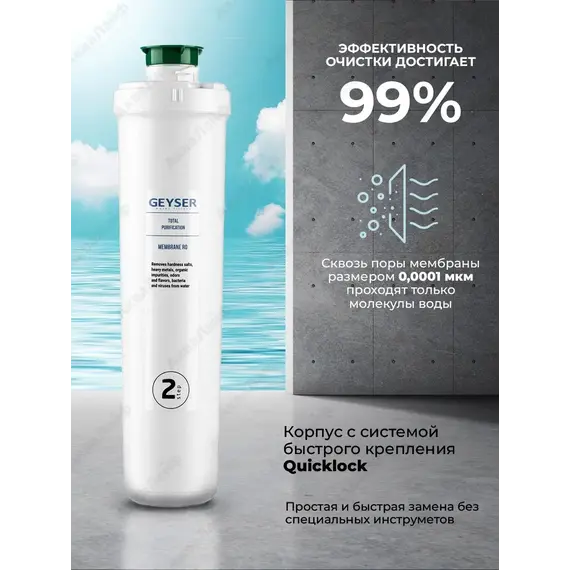 Картридж Мембрана Смарт Гейзер 30644 очищает воду от малейших примесей тяжелых металлов, растворенного железа, хлора, железа, нитратов, сульфатов и солей жесткости. Кроме того, через поры мембраны **не проходят бактерии и вирусы**. Эффективность мембраны достигает 99%.