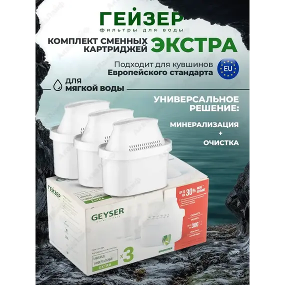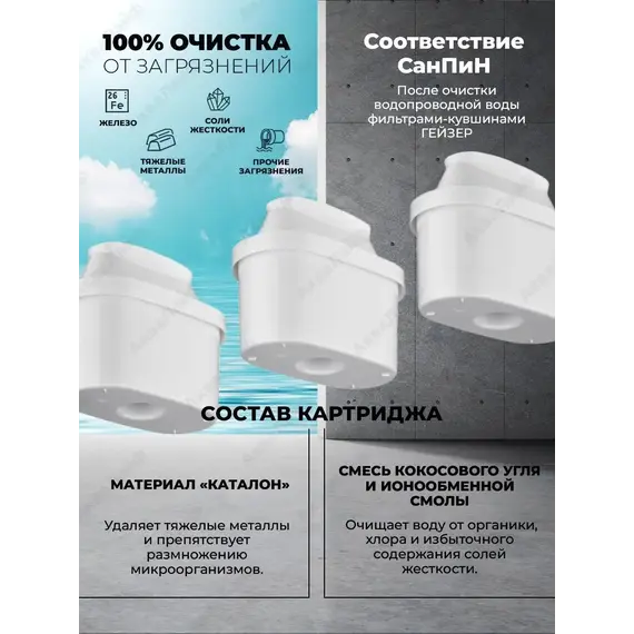 Картридж с материалом Каталон;Уникальная технология минерализации Баскон – насыщение воды полезными минералами – калием, магнием и кальцием;Совместим с фильтром-кувшином формата «Гейзер Гелиос», а также с кувшинами европейских производителей, таких как Brita (Брита), Dafi, Laica;Выгодная покупка – 3 картриджа для фильтров-кувшинов в одной упаковке.Универсальный картридж Экстра 401 применяется в фильтре кувшине «Гейзер Гелиос». Также сменный модуль совместим с кувшинами европейских производителей, таких как Brita (Брита), Dafi, Laica. Предназначен для очистки холодной водопроводной, скважинной и колодезной воды от ржавчины, растворённого железа, тяжелых металлов, хлора, органических соединений и других примесей.Картридж содержит на 30% больше фильтрующего материала по сравнению с обычным модулем (патент №98590).Эффективная очистка воды происходит за счет сочетания волокнистого ионообменного материала КАТАЛОН (патент №2531829) и традиционных сорбционных и ионообменных загрузок. Благодаря уникальной технологии Баскон обеспечивается насыщение воды полезными микроэлементами: калием, магнием и кальцием. Эти микроэлементы находятся в растворенном виде и полностью усваиваются организмом. Бактериостатическая добавка серебра предотвращает размножение отфильтрованных бактерий.В результате использования фильтра вы получаете чистую и вкусную питьевую воду без неприятных запахов и привкуса, чай без плёнки на поверхности, ароматный кофе, безопасное детское питание.Используйте картридж с материалом Каталон в вашем фильтре и пейте чистую и полезную воду!