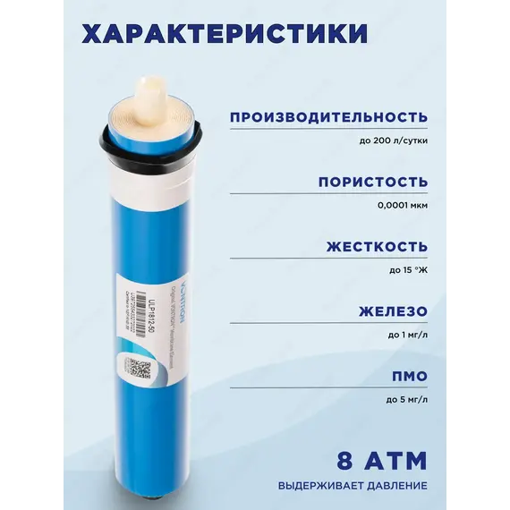 Мембрана ULP1812-50 GPD — Vontron представляет собой сменный рулонный обратноосматический элемент для удаления ржавчины, солей тяжелых металлов, хлора, запаха, привкуса, накипи, органики, ядохимикатов, нитритов, микробов, радионуклидов и др. примесей (размером от 0,0001 мкм).Температура очищаемой воды 4 – 40°С