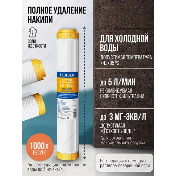 Картридж Гейзер БС - 20SL используется для смягчения жесткой и сверхжесткой воды (средний и высокий уровень минерализации).