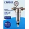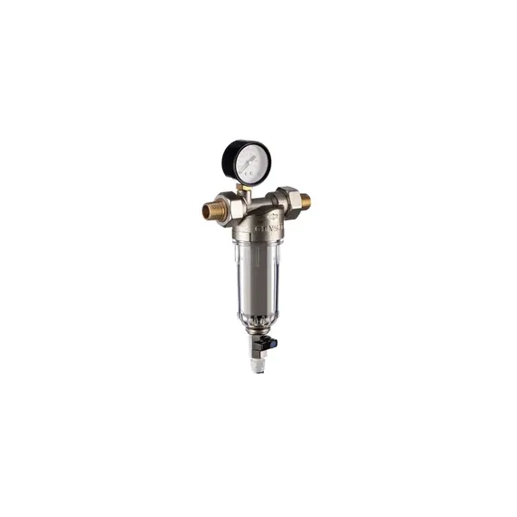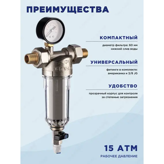 Фильтр с манометром для предварительной очистки холодной воды от механических примесей - частиц ржавчины, волокон пеньки, песчинок, защиты сантехники, бытовой техники подключенной к водопроводу.Фильтр имеет компактные размеры и спроектирован для монтажа в местах с ограниченным пространством; устанавливается на горизонтальном трубопроводе чашей вниз.
