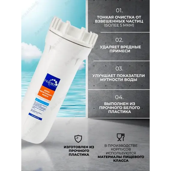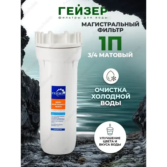 Магистральный фильтр Гейзер 1П 3/4" для холодной водыФильтр Гейзер 1П 3/4" производит тонкую очистку холодной воды от взвешенных частиц (более 5 мкм). В фильтре Гейзер 1П 3/4" используется картридж РР 5 - 10SL. Удаляет ржавчину, песок, ил и другие нерастворимые примеси. Улучшает показатели мутности и цветности воды. Корпус фильтра выполнен из прочного белого пластика. В производстве корпусов используются материалы пищевого класса.Особенности:Тонкая очистка холодной водыКартриджи международного стандарта 10SLВсе необходимое для подключения фильтра в комплектеПрисоединительный размер 3/4"
