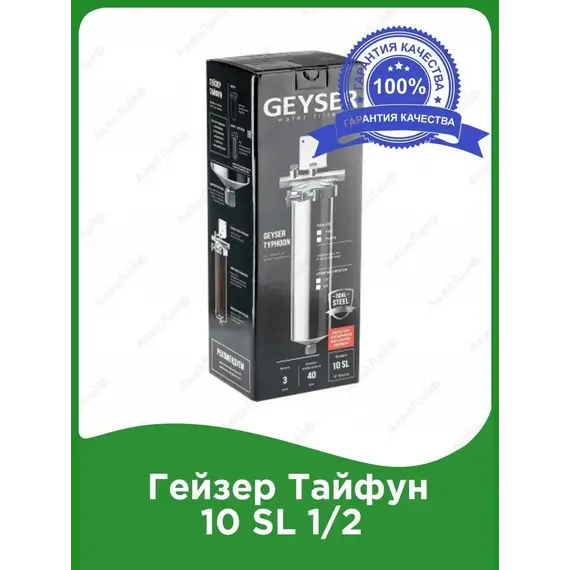 **Фильтр Гейзер Тайфун 10SL 1/2"** производит тонкую очистку горячей или холодной воды от взвешенных частиц. Используется картридж ПФМГ 20/10-10SL. Удаляет ржавчину, песок, ил и другие нерастворимые примеси. Улучшает показатели мутности и цветности воды. Корпус фильтра выполнен из высококачественной нержавеющей стали.Картридж прижимается к крышке корпуса стальным кронштейном с прижимной пластиной и направляющими. При первичной установке или в случае замены картриджа требуется оставить внизу свободное место **не менее 2/3** от высоты колбы. Предусмотрен клапан для сброса воздуха и избыточного давления, расположенный в верхней части фильтра на крышке.- Тонкая очистка холодной и горячей воды- Картриджи международного стандарта 10SL- Корпус из высококачественной нержавеющей стали- Присоединительный размер 1/2- Все необходимое для подключения фильтра в комплекте