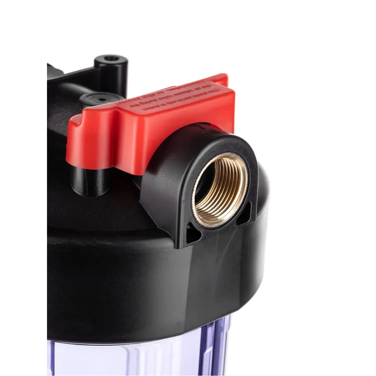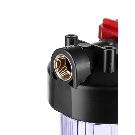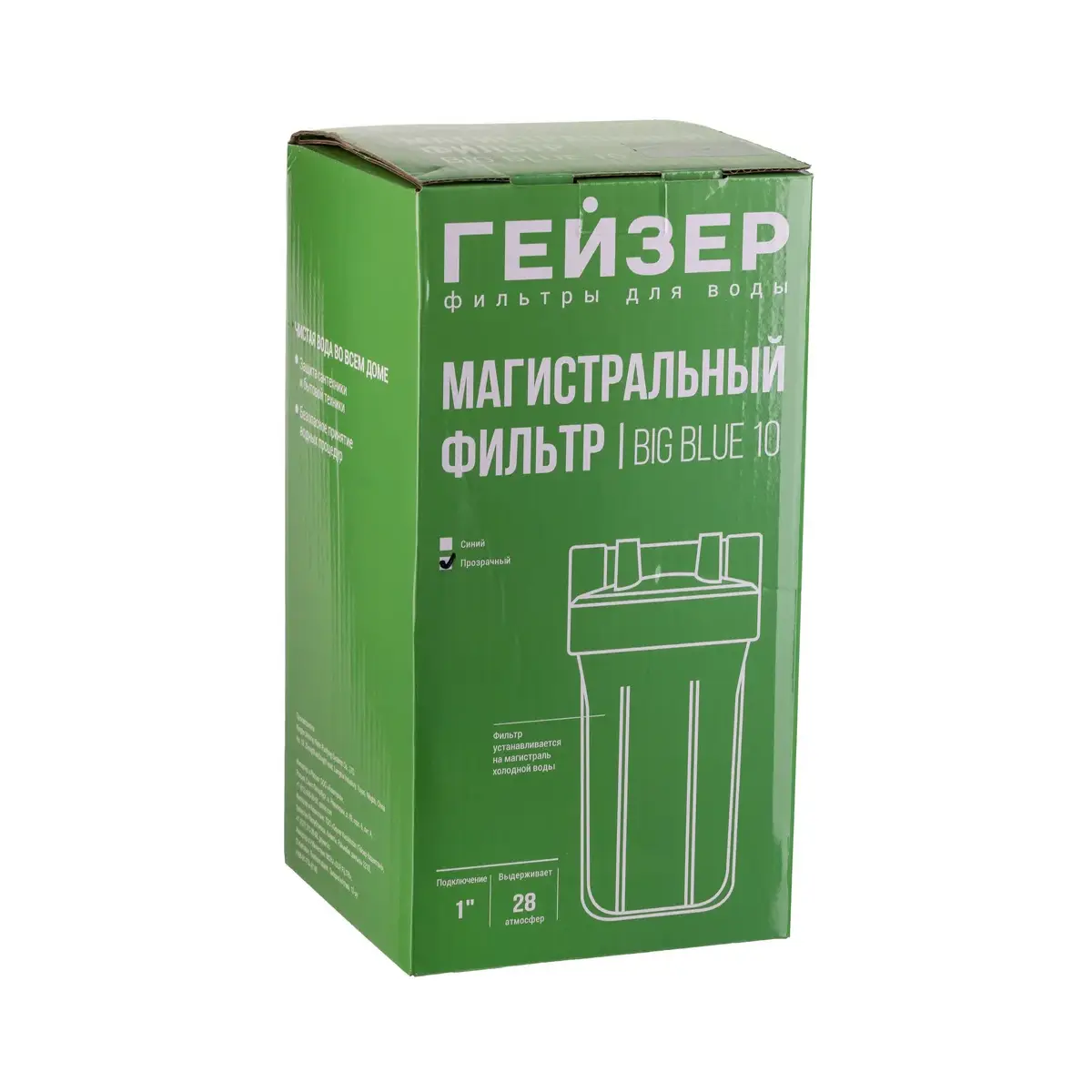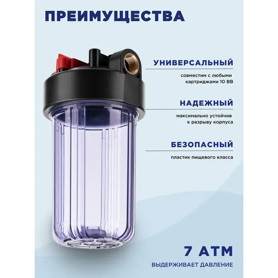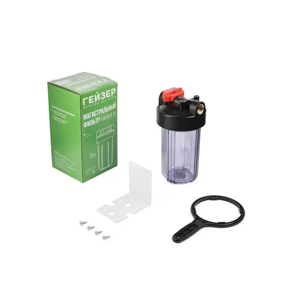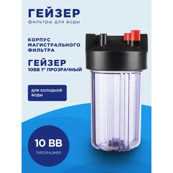 Корпус Гейзер 10BB прозрачный изготовлен из прозрачного полипропилена; крышка корпуса – черный полипропилен с латунными вставками. Корпус рассчитан на работу под давлением и установку на входе в систему холодного водоснабжения. В производстве корпусов используется только первичное сырье пищевого класса.