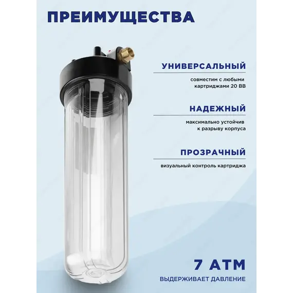 Корпус 20BB изготовлен из прозрачного пластика; крышка корпуса – из полипропилена. Корпус рассчитан на работу под давлением и установку на входе в систему холодного водоснабжения.