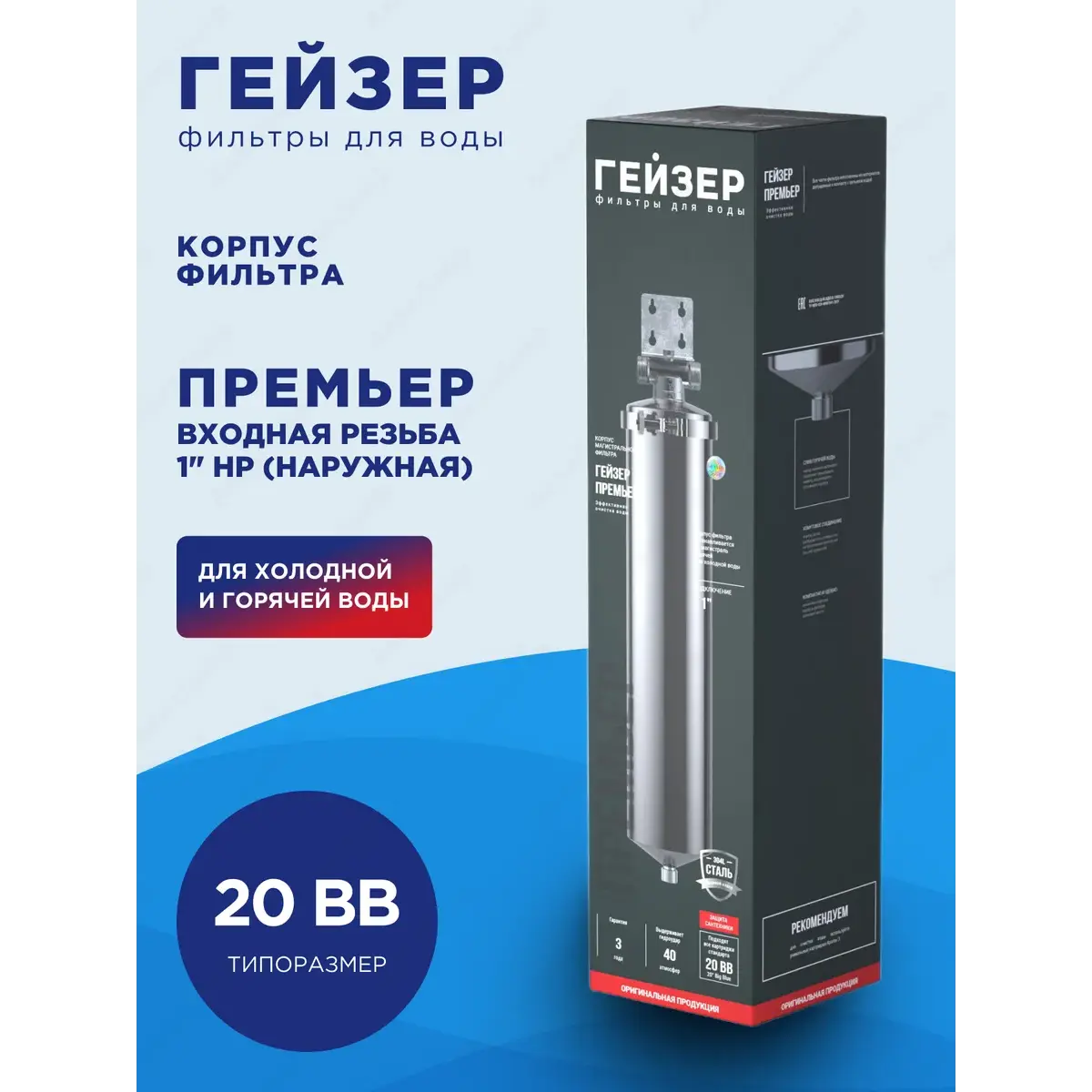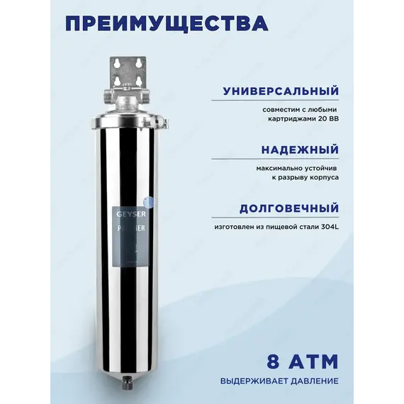 Гейзер-Премьер 20BB 1" устанавливается на вход в систему горячего или холодного водоснабжения. Корпус фильтра изготовлен из высококачественной нержавеющей стали марки 304L, устойчивой к возникновению коррозии, что гарантирует высокую надежность и многолетнюю работу фильтра.