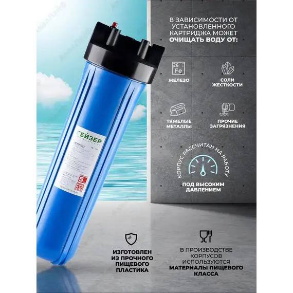- Используется с картриджами стандарта Big Blue 20- Присоединительный размер 1- Более высокая производительность и ресурс за счет использования картриджей стандарта BB.- Производство: Россия. Гарантия 5 лет.Корпус магистрального фильтра синий Гейзер 20"ВВ на холодную воду. На корпусе имеется кнопка для сброса излишнего давления. Латунные ниппеля. Корпус рассчитан на работу под давлением и установку на входе в систему холодного водоснабжения. В производстве корпусов используется только первичное сырье пищевого класса. Можно устанавливать как один, так и комплектовать с другими корпусами для лучшей очистки воды. Можно установит на входе в дом, или после скважины. Для большого объема воды.