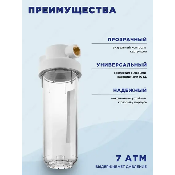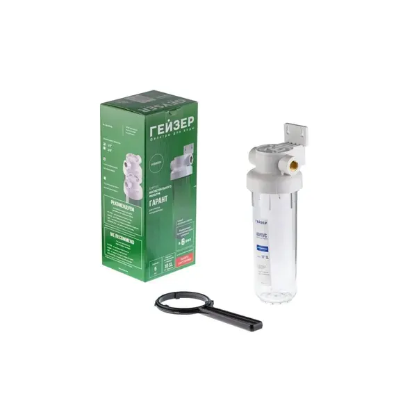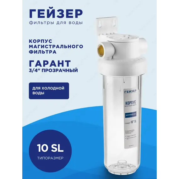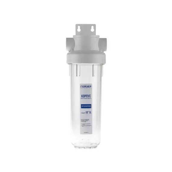 Корпус фильтра Гейзер Гарант 3/4" 10SL рассчитан на работу под давлением и установку на входе в систему холодного водоснабжения. Выполнен из суперпрочного пластика ПЭТ пищевого класса, который обладает повышенной стойкостью к механическим повреждениям.